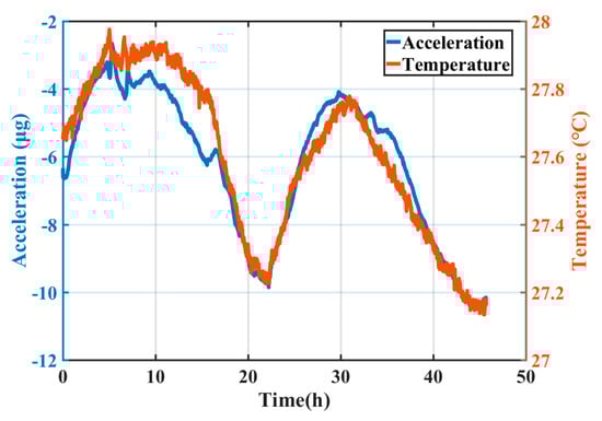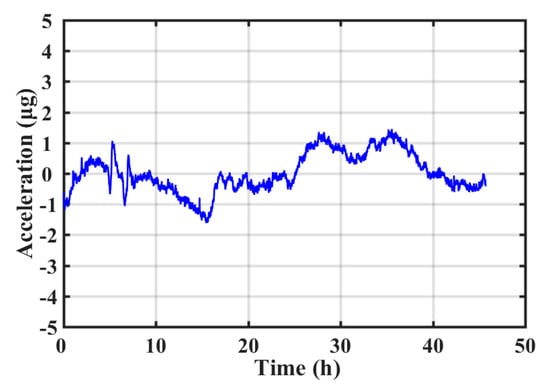 Since the silicon-based MEMS accelerometer had a much larger temperature coefficient of Young’s modulus than the commonly used quartz-based high-precision accelerometers, in order to obtain high-precision performance, the thermal drift of the MEMS accelerometer needed to be minimized. The MEMS high-precision accelerometer with the integrated temperature sensor was placed in a passive thermal insulation box for long-term stability test in the lab with the temperature controlled by the air conditioner. The integrated temperature sensor was for in situ monitoring temperature change of the accelerometer. The stability test lasted for 46 h with a sampling rate of 1 Hz. The output of the MEMS accelerometer is illustrated in Figure 12 and the stability could be calculated to be 2.15 μg (1σ). The temperature change measured by the integrated temperature sensor is also shown in Figure 12. The correlation coefficient between acceleration and temperature was as high as 0.95. Therefore, the first-order linear fitting between the acceleration output and the temperature output was performed. The goodness of fit was 0.91 and the temperature coefficient of the MEMS accelerometer was 8.608 μg/°C. After deducting the temperature effect, the stability of the MEMS accelerometer could be reduced to 640 ng (1σ), as shown in Figure 13. It can be seen that the on-chip integrated gold-film temperature sensor could correlate the acceleration caused by temperature change, further improving the stability of the MEMS high-precision accelerometer.