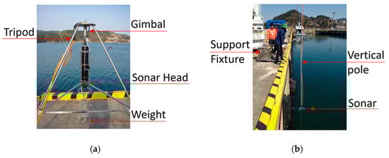 General sector-scanning sonar image acquisition methods: (a) Horizontal image acquired by tripod deployment; (b) Vertical image acquired by pole-mount deployment.
