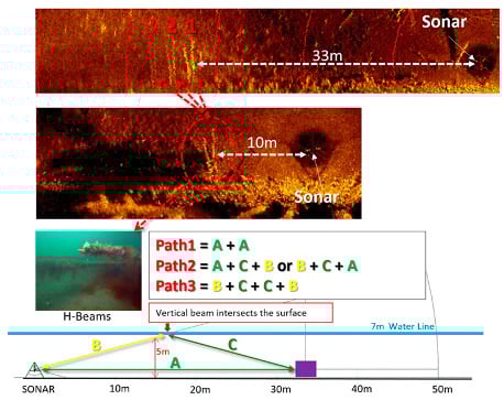 Multipath noise and sea surface reverberation significantly affect the resolution when acquiring the images of a target at the seabed in shallow water []. Figure 3 demonstrates three possible paths that multipath noises can occur. When a thermocline is present, the number of paths can increase to five. In our field tests, the depth was about 7 m. The operation range of the sonar on the tripod was 50 m. The step size was 0.225°. The top image in Figure 3 shows the target located at 33 m from the sonar. The closest target from the sonar (target 1) is shown as a sonar image of a H-beam and has the strongest reflection signal. The images of targets 2 and 3 are less clear as the paths become longer compared to target 1. The middle image in Figure 3 was taken when the sonar was moved closer to the target (a distance of 10 m). Targets 2 and 3 are not shown here, which means that targets 2 and 3 in the top image are the results of multipath noise. The actual picture of the beam taken by a diver is shown at the left of the third row of Figure 3. The bottom plot of Figure 3 illustrates three possible paths. If the target is at the same level as the sonar, we can draw an isosceles triangle with the apex being the point where the vertical beam intersects the surface. This implies that the multipath noise can be eliminated if the apex is located at the halfway point of the sonar range.
