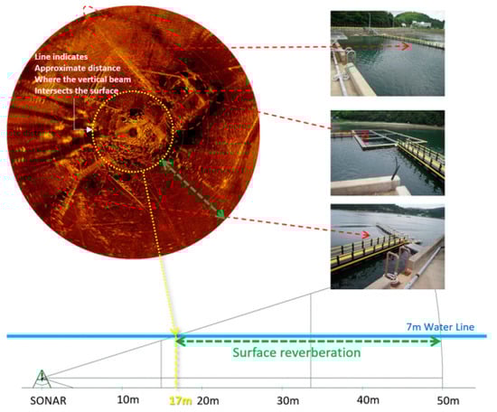The sonar image in Figure 4 shows a representative case of sea surface reverberation. Again, the water depth was 7 m. The sonar operation range was 50 m with a step size of 0.225°. The green arrow on the sonar image indicates the at-risk region where sea surface reverberation can occur. To the right of the sonar image are the actual pictures of a fish-cultivation farm and a float bridge connecting the farm with the land. The farm and the bridge are shown as artifacts in the sonar image (marked by the dotted ellipses and arrows). The mechanism of surface reverberation is illustrated in the bottom drawing of Figure 5. The reverberation starts at approximately 17 m from the sonar. The structure above the surface is mirrored and superimposed with the underwater image due to the reverberation.