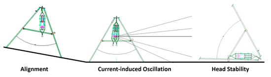 The following three techniques should be considered for acquiring high-resolution sonar images using a tripod in shallow water, regions with a strong current, or an uneven or sloped sea bottom. First, the sonar head must be stabilized by minimizing the current-induced oscillation. Second, the sonar must be properly aligned to provide the necessary posture (elevation, inclination angle, direction angle, etc.). Finally, the sonar must be arbitrarily located. In an environment with weak or no tidal current, it is possible to maintain the image quality even if the tripod is on an uneven or sloped seafloor because the sonar head is aligned with the gravitation due to the gimbal mechanism; however, as shown in Figure 5, it was difficult for us to install the sonar head in a stable position on a sloped floor parallel to the ground, and also not easy to suppress the oscillation due to the strong current. There are several ways to do achieve stability: by deploying sensors from a fixed structure on the surface or barge using a spreader bar, using a fixed tripod instead of the gimbal, and installing a stabilization fin to remove the vortex behind the sonar using a drop cable deployment in a strong current environment; however, it is difficult to maneuver a sonar and maintain a desired posture and position in an uneven or sloped sea bottom with a strong current, even if these methods are used.