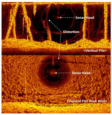 Sector-scanning sonar is used to inspect slopes and vertical structures such as beams, dams, and bridges. For these applications, the sonar head is installed vertically, and close to the target surface. Both sector-scanning sonar and side-scanning sonar have a problem that creates an illusion of deformation of the object adjacent to the sonar, which is called slant range distortion. This is caused by displaying the 3D data on a 2D monitor, and is generated from the side lobe of the acoustic sensor []. The top image of Figure 6 shows an image of vertical piles supporting a pier, and shows the distortion that occurs in the pile near the sonar head. The image below shows a vertical pier rock wall and that the shadow of the stonework at 12 o’clock is curved from the sonar head. Conventionally, the problem is solved by overlapping the normal image acquired at a distance and removing the distorted image.