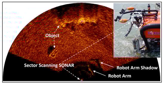 If a sector-scanning sonar is usually installed on an underwater robot or vehicle, it is highly useful to detect objects, avoid obstacles, and acquire the necessary information for navigation []. By using the precision position sensor installed in a remotely operated vehicle (ROV), it is possible not only to know the position of the acquired image but also to continuously obtain the image by moving to the desired position. As shown in Figure 7, the work-class ROV has the advantage of estimating the pose of the manipulator and can maneuver it by observing the shadow of the manipulator; however, once the position of the sonar is fixed to the ROV frame, it is difficult to change the position during operation, and, in the case of a work-class ROV operation, an additional sonar is required to cover the full 360° due to its size. The most general issue is that the standard form of the ROV is a shape of a rectangular box, so it is hard to move the ROV along the desired course while also maintaining the desired heading and altitude under an environment with a strong current.