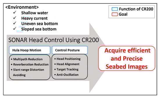 Figure 8 shows a strategy for overcoming the conventional technical problems summarized in Section 2.3 using the CR200 under four environmental conditions (shallow water, regions with a strong current, and an uneven or sloped sea bottom) and efficiently obtaining a precise seabed image. HHM, expressed as a function of CR200, represents the technology corresponding to improvement 1 in Section 2.3. This technology selectively separates the sea surface reverberation from the bottom reverberation to reduce noise caused by both multipath and reverberation, and to minimize the slant range distortion that occurs when a support ship, a large structure, or an ice shelf are located close to the sonar, perpendicular to the up position. The second function of CR200, the control posture, is a technology that provides the desired posture and position to the sonar. As described in improvement 2 in Section 2.3, with this technology, the oscillation of the sonar can be suppressed and the ROV can move to the desired course while maintaining a certain altitude and heading. The last technology, described in improvement 3 in Section 2.3, maximizes the efficiency of image acquisition. This enables the sonar installed on the ROV to acquire the image of the seafloor of the widest area in one scanning, while minimizing the shadow section caused by the interference of the ROV body itself.