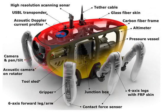 The CR200 was developed in 2013 for exploration and scientific research on the seabed in areas where the current is very strong, such as the West Sea in Korea []. It is designed to investigate the seabed in detail and to be suitable for precise underwater work, featuring six legs, which consist of multiple joints instead of a propeller type actuator. The six legs consist of four dedicated legs with four degrees of freedom and two robotic arms with seven degrees of freedom, allowing it to walk on the seafloor like a crab and perform underwater work using its arms.