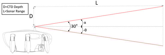 According to reference [], the pitch angle, α, can be calculated by Equation (1), where D is a constant obtained by subtracting the altitude of CR200 from the water depth; this value can also be taken from the conductivity-temperature-depth (CTD) sensor. As shown in Figure 11, the vertical beam angle of the sensor is 30°, and as described in Section 2.2, the length is 25 m, which is useful to minimize noise as a result of multipath when the sonar range is 50 m. According to the equation, the α value can be calculated to avoid noise caused by multipath, which, depending on the change of the water depth and the resulting tilting angle, can be given to sonar and used as an input to the HHM inclination angle.