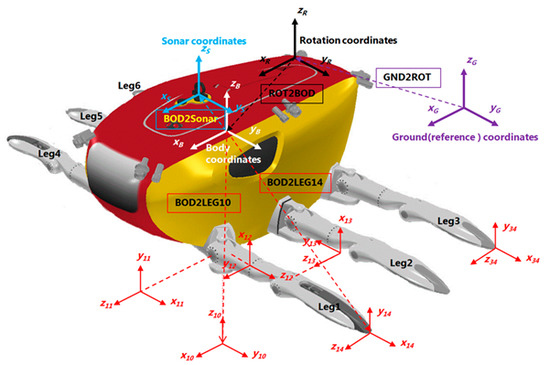 where is the transformation matrix from the body coordinate system to the end of the i-th leg coordinate system; is a transformation matrix that takes into account the positional displacement () of the body-centered coordinate system viewed from a fixed coordinate system during posture transformation; is a transformation matrix from the rotation coordinate system to the body coordinate system considering the rotation transformation () defined in the rotation coordinate system during the change of the body posture; the subscript init represents the initial value. If we define sensor coordinates at the center of the scanning sonar header shown in Figure 12, the end of the leg with respect to the sensor can be written as follows: