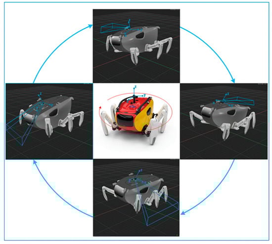 The coordinate system of CR200 is shown in Figure 12. The position vector of the end of the leg relative to the center of the body () to generate the desired displacement of the body position () can be obtained by the following equation []: