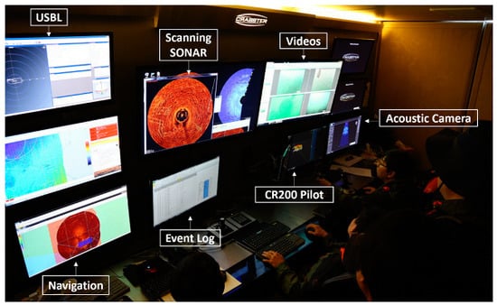 In this section, we describe the sea trial and its results to verify the CR200 function discussed in Section 3.1. The sea trial was conducted from 16 April to 15 May, 2015 [], in the Mado area, located in the West Sea of Korea, with a water depth of 4 to 6 m. Figure 14 and Figure 15 show the support barge and control room of the CR200. The size of the barge was 34 m by 14 m, and was capable of accommodating a crane for the launch and recovery of the CR200 and housing the control room. Because the region was an area where artifacts were being excavated, we randomly placed samples for testing and conducted a mission to explore and collect them.