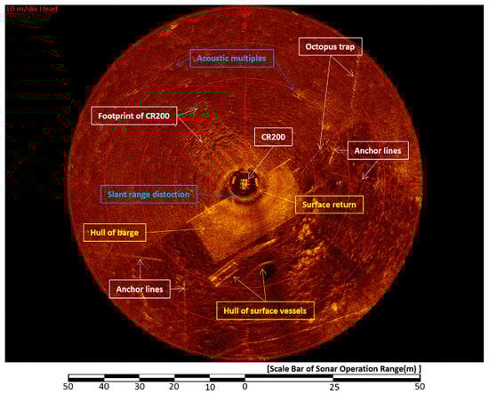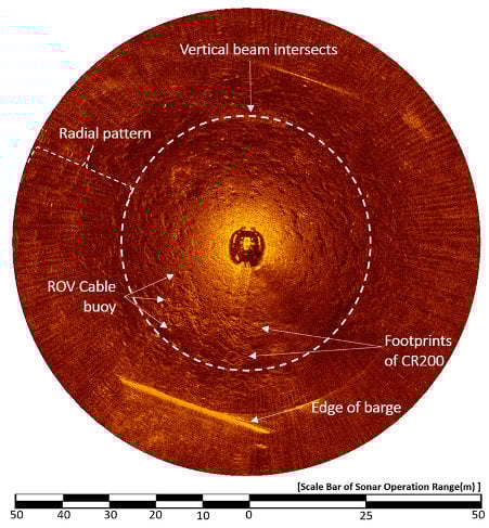 Figure 16 shows a sector-scanning sonar image obtained in a horizontal position on 30 April, 2015. The sonar was run at a 50-meter operation range, a height of 1.6 m, and a step size of 0.225°. As seen in Section 2, the structure on the sea surface and object in the seabed overlapped because of the shallow water depth. In the center of the image, the top of the CR200 is shown and, at 6 o’clock, the bottom of the support barge and two boats moored to the barge appeared. Other objects in the image are the four anchor lines of the barge and an octopus trap at 2 o’clock; a trace of the CR200 on the seabed can also be seen.