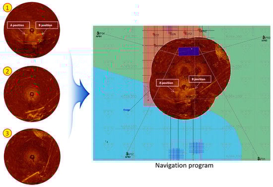 As described in Section 2.2, when a sector-scanning sonar survey is performed using a general ROV, it is difficult to acquire an image for the entire 360-degree direction, and there is a limit in maintaining the set direction and proceeding toward the target. Figure 22 shows the results of the exploration of the seabed, based on the position of the differential global positioning system (DGPS) of the barge while the CR200 accumulated a detailed image of the seafloor, acquired by the downward HHM at a shallow water depth. Figure 1 shows the first step to calculate the relative position of the CR200 using DGPS information for the A and B positions of the bottom of the barge. The next step was to synthesize images 2 and 3 one by one, and it was possible to operate in real-time, as shown in the screenshot of the Hypack’s navigation program. This operation suggests that it is possible to accurately measure the location of the seabed or the object on the seabed using only DGPS information of the underwater structure without an additional underwater location tracking system. Considering the deepwater depth case, both upward and downward HHMs were acquired at a fixed position; the former applies to the calculation of underwater sonar center positions, and the latter applies to the collection of submarine information. In this way, location measurements based on the DGPS information are possible in deep water.