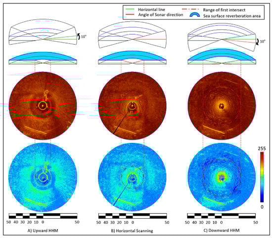 We analyzed the difference between the effects of the upward, horizontal, and downward HHM using Equation (1), and Table 3 displays the results. The vertical beam size of the sonar used in the analysis was calculated to be 30°, and it was assumed that there was no side lobe effect. Table 3 shows the range of the first intersection and sea surface reverberation area at an operating range of 4 to 10 m water depth. When the sea surface reverberation area is 100% in the horizontal state, the ratio of the sea surface reverberation area to the HHM inclination angle is shown. The sensor operating radius used in the calculation of the table is 50 m, and the operating depth was the value obtained by subtracting the sensor head altitude value of 1.6 m. In particular, the multipath noise was generated when a range of the first intersection exists within the first half of the sonar operation range, as detailed in Section 2.2. It can eliminate multipath and reduce sea surface reverberation by having it exist at a distance of more than 25 m. This is a fundamental improvement of the sonar image.