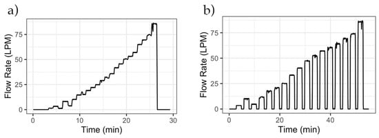 After the pulse resolution for each meter was calculated, the dataloggers were further tested for accuracy under different flow scenarios, e.g., for capturing rapidly changing flow rates and events of short duration, as these are common situations in residential settings. We conducted two additional laboratory experiments. In Experiment 1 (Figure 7a), the flow rate through the meter was varied by opening a flow-controlling valve. The flow rate through the meter was increased in steps without interrupting the flow between flow rate increases. We then conducted a separate experiment (Experiment 2, Figure 7b) where the flow rate through the meter was increased in steps, but the flow-controlling valve was quickly closed between each flow rate change. Manual readings of the meter’s register were taken before, during, and after each experiment to compare the volume registered by the meter’s register with the volume registered by the datalogger. The flow rate signature of Experiment 2 is similar to the signature of the experiments conducted to calibrate the device (Table 5).