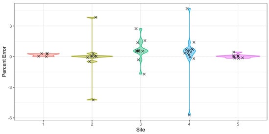 Percent difference between the volume registered by the meter (calculated as the difference between two consecutive, manual readings of the meter’s register) and the volume registered by the CIWS datalogger (calculated as the number of observed pulses multiplied by the pulse resolution of the meter) for multiple deployment periods at each experimental site. The points in the figure represent individual percent errors computed for every field visit at each site. Values have been spread across the x axis for visualization purposes. The number of deployment periods was 5, 9, 11, 14, and 10 for each site.