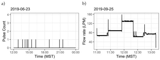 Sample of the events observed. (a) Raw data collected at Site 5 on June 23, 2019 from noon to midnight. Multiple 4 s, single pulse events were observed at a time when no other water use occurs. (b) An irrigation event at Site 1. At this temporal resolution, flow rates from different irrigation zones can be observed.
