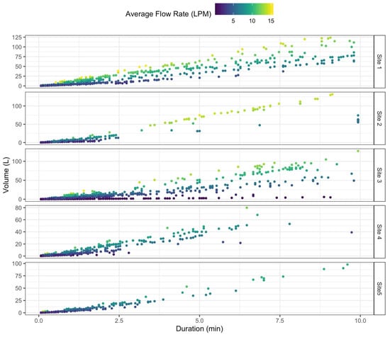 From the total number of events identified using our simplified procedure, 39% (Site 1), 48% (Site 2), 91% (Site 3), 18% (Site 4), and 89% (Site 5) were classified as leaks, resulting in 85% of the total combined events being leaks. Of the remaining 15%, approximately only 1.3% had a duration larger than 25 min, which are likely to be irrigation or overlapping events. None of the participants reported having a swimming pool. Most (96%) of the non-leak events had a duration less than 10 min and an average flow rate less than 15 LPM. Figure 11 presents the duration and volume for these events at each site. Volume and duration alone do not seem to discriminate different types of events. However, when adding the average flow rate (colors of the points), levels between the events begin to appear. Events at these shorter durations should include toilets, which have similar volumes, durations, and flow rates along with faucets and showers, which will have different duration and volumes but occur at similar flow rates. Dishwasher and clothes washer events should also be similar, although varying designs, manufacturers, and available cycles would contribute to differences. The distribution of events also varied among the sites, which could indicate differences in personal preferences, water fixtures, or both. Although a rigorous clustering analysis is beyond the scope of this paper, Figure 11 shows that even 3 calculated event attributes begin to illustrate differences in event types. All of the event statistics, including those not shown in the figure (e.g., mode flow rate and maximum flow rate), could be used as factors in a more sophisticated clustering approach to classify each event into end use categories.