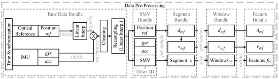 Interpolation and Resampling. Pre-processing starts from the bundle of raw input data (from accelerometer , gyroscope , optical reference system ref). We resample the reference positions ref to 1000 Hz. Subsequently, we synchronize them with the measurements of acc and gyr. To clean up the synchronized measurements, we visually and statistically detect corrupt data instances and outages and then remove them. We fix short dropouts (<20 ms) by re-sampling and re-interpolating. To generate several datasets for our benchmarks, we re-sample the clean measurement sets at 50, 100, 200, and 400 Hz. Section 4.2 discusses the configuration that offers the highest accuracy of velocity estimation. Afterwards, we calculate the SMVs of the data. We evaluate both the SMVs of the individual sensors (two-dimensional (2D): , ) and a combined SMV of both sensors (1D: + ).