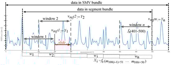 Bundling. From the SMV bundle, we create the segment bundle to evaluate the classic baseline PDR method. While the SMV bundle represents all of the initial raw data bundle, the segment bundle only holds the segment of the data that matters for the user’s activity, i.e., we remove the initial and the final parts (that may have been accidentally recorded before and after the activity) and only keep the repetitive stretches of the movement, see Figure 2 for an example. We calculate and by differentiating the 2D velocities, i.e., the translational layer spanned by the x- and y- axes obtained from the reference system (w.r.t. time and norm). From there, we create the window bundle to evaluate state-of-the-art DL methods and our hybrid DL method. The window bundle is a representation of the data in the corresponding segment bundle as a set of consecutive windows. We consider both overlapping and non-overlapping windows, see the paragraph on parameters below. Figure 2 sketches the slicing process of a segment into a bundle of windows. From there we create the feature bundle to evaluate the ML baseline method. For each of the windows in a window bundle the feature bundle holds the features that we extract from the data, see Section 4.3 for details.