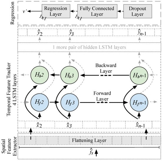 “Temporal feature tracker” built from two BLSTMs, each with two hidden forward () and backward () long-short-term-memory (LSTM) layers (only one shown; no LSTMs for and ).