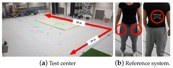 Reference System. We recorded refe-rence data (3D positions) with 28 cameras of the millimeter-accurate optical Qualisys motion tracking system (spherical error probable () ≤5 mm and °). The cameras are mounted on the edges of the upper side of the test area and cover a volume of 11.025 m (45 7 m). The subjects wore four small trackable reflective markers, attached to an elastic ribbon, see Figure 6b. All of the cameras had a clear field of view when we tracked each subject’s position and orientation with constant 100 Hz.