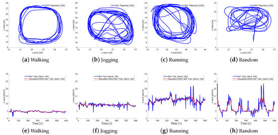 PDR systems consist of two components: a heading and a velocity estimator. In this article, we focus on optimizing velocity estimation for complex and dynamic movement patterns and a non-rigid attachment of the sensors to the subjects’ bodies. Instead of modeling the complex relation between the measured inertial data and the subject’s velocity explicitly, latest methods [9,11,12,27,28,29,30,31] use machine learning (ML) and deep learning (DL) to estimate the velocity. However, these algorithms are trained and evaluated while using data with minor velocity and orientation variations. However, for applications, such as sports, it is desirable to have a velocity tracking method that can continuously track the subject’s velocity, even if there is a highly dynamic progression in motion states. From this follows that we need both a method and a representative dataset that generalize over different motion states.