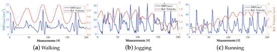 In total, we recorded data regarding 23 h = 1381 min of motion data (=4 activities × two sensors × 23 subjects × 7 min (SD 1 min)) with circa 30 min per sensor (two or one) per subject (SD ± 4.6 min). The full study resulted in a total traveled distance of around 107 km (about 214 km for two sensors per user) for all activities (walking: ~14 km; jogging: ~29 km; running: ~38 km; and, random: ~26 km) at different speeds (average for walking: 1.4; min. 0.8; max. 2.2; SD 0.31; jogging: 2.8; min. 1.5; max. 3.4; SD 0.34; running: 3.6; min. 2.9; max. 7.9; SD 0.67; random: 2.5; min. 1.2; max. 7.8; and, SD 3.19). Figure 7 shows an exemplary subset of 10 min of motion for a single user. The graphs show trajectories (top row) and velocities (bottom) of all activities (left to right). Each data point represents a single window without overlap. Figure 8 shows SMV acceleration (blue) and velocity (red) for walking, jogging, and running for 200 measurements. The signal complexity increases with higher velocities, peaks get less prominent. The complete data pool consists of 92 segment bundles (23 subjects × four activities) with 64,688 consecutive windows (without overlap, = 128, = 100 Hz approximately 350 windows per user, per activity, and per sensor) or 129,375 overlapping windows (50% overlap, = 128/2 = 64) with corresponding .