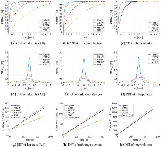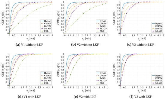 Evaluation on V3. Remember that we do not evaluate PDR on V3, as there are no segments. In V3, velocities are homogeneously distributed over 3 to 13 km/h for all users; there is less redundancy than in V2. Table 2 holds the results in its bottom rows. While ML-GP (MAE: −16% and : −16%) and RoNIN (MAE: −37% and : −38%) benefited the most when moving from V1 to V2, now C/RNN (MAE: −50% and : −49%) and Hybrid (MAE: −19% and : −22%), see the strongest improvements at a much more fine-grained level (below 20 cm) when moving from V2 to V3. Hybrid (best) shows the smallest error on V3 (MAE = 0.17 m/s; = 0.53 m/s), followed by C/RNN (MAE = 0.28 m/s; = 0.89 m/s). Of course, all four methods in the accuracy benchmark perform remarkably better with V3 than on the other data set variants. The reason might be that V3 has a suitable distribution of data and therefore also statistical information. It is known that such an information distribution may lead to quasi optimal results of the estimators [77]. This is in line with the CDF-Figure 9c that now tells us that, in 70% of all cases, the errors of the four data-driven methods are below 0.75 m. Now, all methods probably focus on denoising the raw data, extracting the best and features, and having a clear sight on what is important to memorize.
