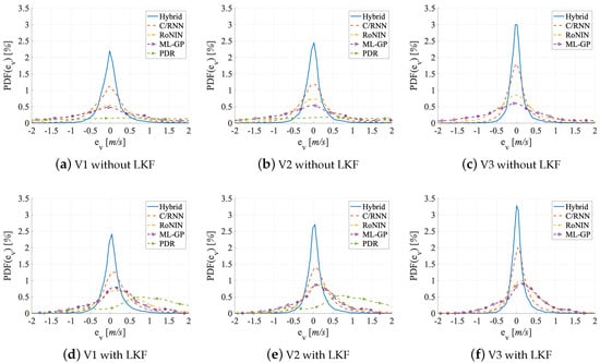 Looking at the small and large outliers of the methods, we see that moving from V1 to V2 remarkably reduces the number of large outliers as MSE and RMSE both decrease across all five estimators by up to 46% (MSE of RoNIN). However, a closer look shows that, while Hybrid has the fewest outliers (MSE = 0.12 m/s; RMSE = 0.32 m/s), followed by C/RNN (MSE = 0.48 m/s; RMSE = 0.69 m/s), the other estimators still have serious problems (ML-GP: MSE = 1.04 m/s; RMSE = 1.02 m/s; RoNIN: MSE = 1.15 m/s; RMSE = 1.07 m/s). This is in line with the more narrow bell shape of all curves, except PDR’s curve, in the PDF-Figure 10b. The smaller MSE and RMSE values on V2 than on V1 might indicate that all methods focus more on denoising (i.e., filtering out small and large outliers) than on learning redundant information.