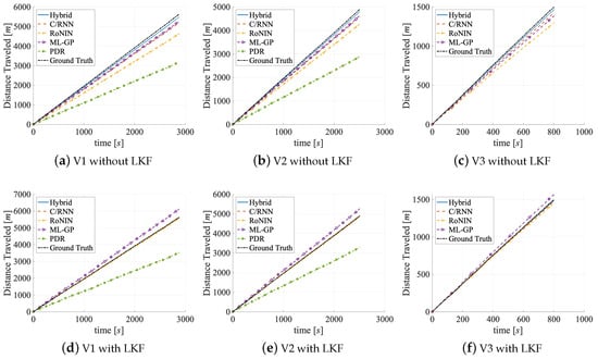 The distance errors show that PDR has serious problems (DET = 2.1 km), followed by RoNIN (DET = 460.47 m), while the other three methods do not show abnormalities. In the DET-Figure 11a, both PDR and RoNIN are farther away from the ground truth than the other three methods. Interestingly, while PDR makes large DET mistakes and also has a large DEPM ( = 0.37 m), for RoNIN its high DET value does not correlate with its low DEPM value. Obviously, DEPM does not necessarily directly correlate with DEPM, instead the large RMSE values (PDR: 2.71 m/s; RoNIN: 1.46 m/s) suggest that there are outliers that may cause the high DET values.