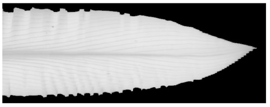 where is the calibrated image, is the raw hyperspectral leaf image, is the dark reference image, and is the hyperspectral image of the white reference. Then, the leaf tissue was segmented from the calibrated images using a segmentation procedure with a convolution methodology [12]. A vector of sequential integers from −20 to 20 was multiplied by the reflectance intensity vector from the red-edged region (680–720 nm). By choosing threshold 7 as the boundary between the plant tissue and the background, the plant tissue was successfully segmented, as shown in Figure 2. The spectral features of the leaf tissue (grey region in Figure 2) were used in this study. Due to the high resolution of the leaf images, the detailed spectra distribution features of the leaf were obtained.
