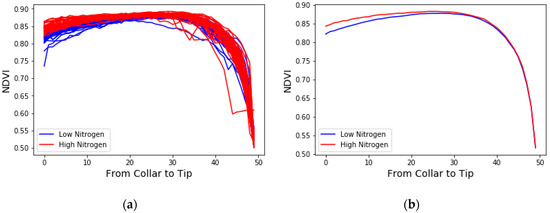 The average NDVI value of each scanning line along the leaf under two nitrogen treatments at the V8 stage. The X coordinate is the rescaled leaf from the leaf collar (0) to the leaf tip (50). (a) All 64 corn leaf samples for genotype B73xMo17; (b) The average of each nitrogen-stressed group. Red indicates the high nitrogen group, and blue indicates the low nitrogen group.