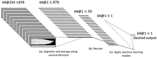 Overall schematic of the distribution feature analysis, from the raw NDVI image to the final prediction. It contains three major steps: (a) Segment the leaf and average along the vertical direction; (b) Rescale; (c) Model with the machine learning (ML) methods. Here, 64 @ 254 × 878 means that the original size of the NDVI image is 254 × 878, with 64 replicates for the model training.