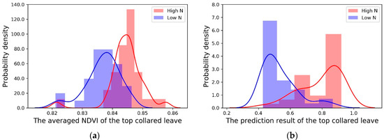 The probability density distribution (PDE) of top-collared leaves for different nitrogen treatments: High N (red); Low N (blue). (a) The PDE of the averaged NDVI. (b) The PDE of the prediction results from the Random Forest algorithm.