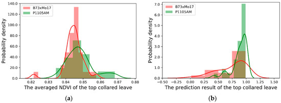 The probability density distribution (PDE) of top-collared leaves for different genotypes: B73xMo17 (red); P1105AM (green). (a) The PDE of the averaged NDVI. (b) The PDE of the prediction results from the Random Forest algorithm.