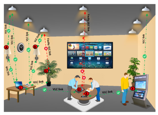 Visible-light communication (VLC) is a last-mile access technology which uses visible light with wavelengths between 380 and 700 nm. This technology uses light-producing devices, such as light-emitting diodes LEDs, for the dual purpose of lighting and data transmission that can dramatically reduce cost and complexity. Another advantage of the VLC system is that it does not interfere with technologies in the already overcrowded radio frequency (RF) spectrum. It has potential as a green communication technology and can work complementarily with RF technology for indoor applications, such as providing network access at offices, homes, shopping centers, etc. [1,2,3]. Despite these advantages, connectivity disruption during the movement of the end-user is one of the major challenges of VLC technology. This is due to the short cell sizes of VLC links that require a frequent handover between VLC cells. Furthermore, light interference caused by the overlap of neighboring LEDs in the VLC environment can negatively affect the transmission over the VLC network [4,5,6]. Transmission failure can happen due to shadowing in VLC links. However, for better reliability and greater LEDs link coverage, different light sources in indoor environments, such as ceilings, desks, and floor lights are deployed as relay nodes [6,7,8].