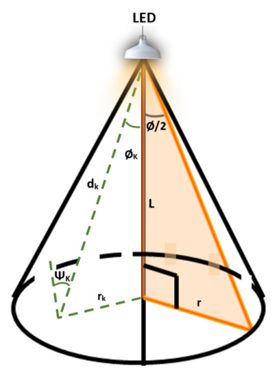 where , and , as indicated in [6,26]. A is the detector detection area; and are the optical filter and concentration gains, respectively; indicates the responsivity of the photo-detector; L is the direct distance(s) from the LED to the user plane; r represents the maximum cell radius of the VLC environment; and is the order of the Lambertian radiation pattern, which is given by: