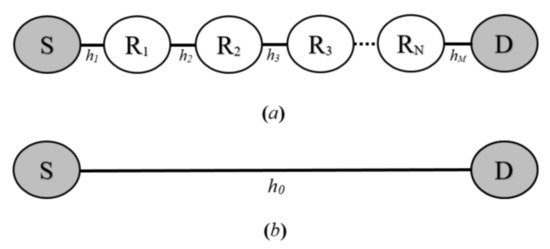 The outage probability and energy efficiency performance of all of the proposed VLC system configurations are analyzed in this section. However, each configuration contains two nodes; namely, source (S) and destination (D) nodes. The communication between these two VLC nodes is achieved either via N intermediate relays, as shown in Figure 3a, or through a direct VLC link, as appears in Figure 3b. In the former configuration, the nth relay is denoted as where . On the other hand, in the single-phase configuration, end-to-end communication is accomplished without relaying.