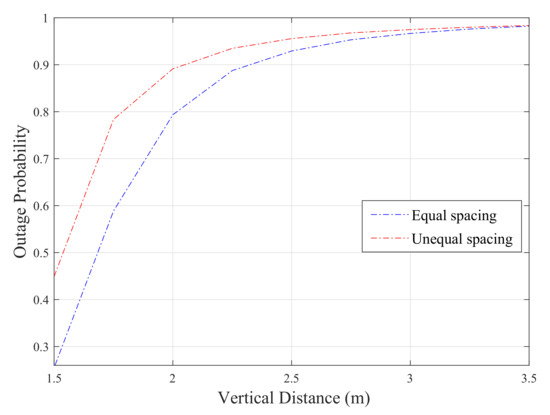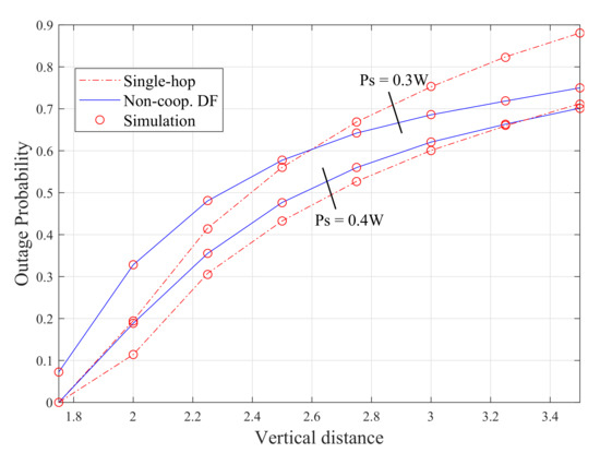 It is also noticeable from this figure that the transmit power has a positive impact on the performance of both systems and the vertical distance can negatively affect the performance of both configurations. For example, in the single-hop scenario, the outage probability increases from 0 to 0.7 as the vertical distance changes from 1.6 to 3.6 m when the transmit power is 0.4 W, which represents a 70% increase. Furthermore, the outage probability is almost 0.9 when the vertical distance is 3.6 m and the transmission power is 0.3 W, whereas it is only 0.7 at the same vertical distance and the transmit power is 0.4 W.