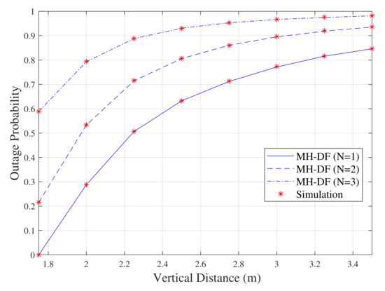 The analytical results of (20) and (23) are illustrated in Figure 5 along with the simulated results. The results show that increasing the vertical distance between the LED and the user plan always results in performance degradation for all of the system configurations. The results also show that the performance of this system setup (i.e., DF-based VLC system) is positively affected by the number of DF relays on the VLC system. For example, when the vertical distance is 3 m, the outage probabilities when N = 1, N = 2 and N = 3 are 0.77, 0.9 and 0.98, respectively.