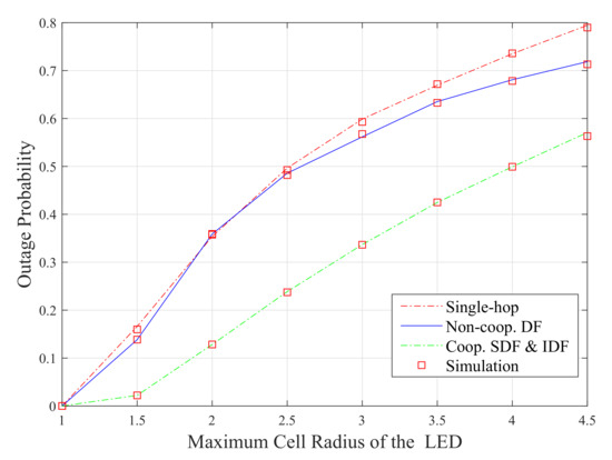 For the sake of performance comparison, the outage probabilities of the different configurations (i.e, the numerical results of (12), (20) and (34)) are compared and presented in Figure 7 as functions of the maximum cell radius of the VLC system. The results show that the performance of all of the considered VLC configurations degrades as the size of the cell radius of the LoS increases from 1 to 4.5 m. It can be seen from the figure that the cooperative DF setups (i.e., SDF and IDF) outperform the other two configurations (i.e., single-hop and DF-based ones). This is because, in cooperative protocols, the capacity of the communication system is substantially improved by the spatial diversity accomplished at the destination node by combining the signals received from the source node and the relay node [32]. When the maximum cell radius is 2 m, the outage probability of the cooperative DF relay scheme is 0.12 and it is almost 0.38 for both single-hop and DF approaches. However, the DF setup has the superior performance over the single-hop one for the higher values of the maximum cell radius of the VLC system (i.e, the maximum cell radius is higher than 2.5 m).