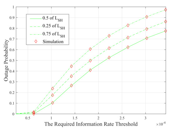 To illustrate the impact of the position of the cooperative DF relay on the performance of the system, the outage probability of this configuration is plotted versus the required information rate threshold in Figure 8.