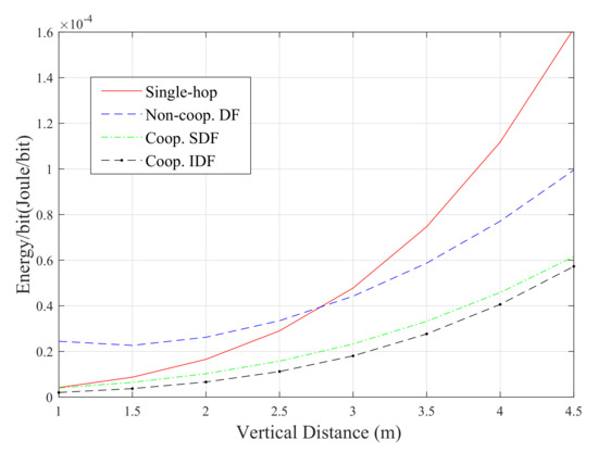 It is obvious from this figure that the IDF approach has superiority over the other relaying protocols in terms of energy consumption. For example, when the vertical distance is 4.5 m, it consumes almost 3%, 60% and 120% less energy compared to the SDF, DF and single-hop approaches, respectively. This can be simply explained by the fact that the DF relay in this system only cooperates when the communication through the direct link fails. However, the SDF scheme consumes less energy compared to both single-hop and DF-based systems. It is also noticeable that, for shorter distances (i.e., the vertical distance is less than 2.7 m), the single-hop approach is more energy-efficient than the DF one. The direct-link approach consumes about 10% and 1% less energy relative to the DF approach for vertical distances of 1 and 2.6 m, respectively. However, this configuration has almost the worst energy performance when the vertical distance is greater than 2.7 m. The other observation is that the consumed energy for all of the considered scenarios boosts when vertical distance becomes higher. This is because the energy consumption of the communication systems is inversely proportional to end-to-end distance.