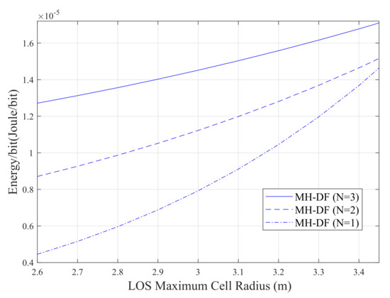 Figure 10 illustrates the effect of increasing the number of relays on the energy performance of the VLC system. The results show that as the number of relays increases, the system becomes more energy inefficient. This because of adding relays on the network contributes more to the total energy consumption of the system. However, it is evident that the system with three DF relays is the less energy-efficient one compared to the systems with two and one DF relays. For example, when the maximum cell radius is 3 m, this system consumes almost 20% and 45% more energy compared to that consumed by the system with two and one DF relays, respectively. It also can be seen that the systems consume more energy when the maximum cell radius of the LoS increases from 2.6 to 3.4 m.