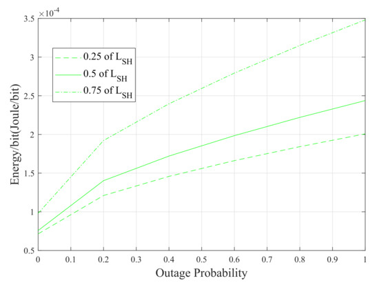where is the energy-per-bit consumption of the single-hop system, and denotes the average optimal source power which is required to accomplish the desired outage probability for the single-phase approach. Here, represents the rate of the data which can be calculated by multiplying the bandwidth and spectral efficiency .
