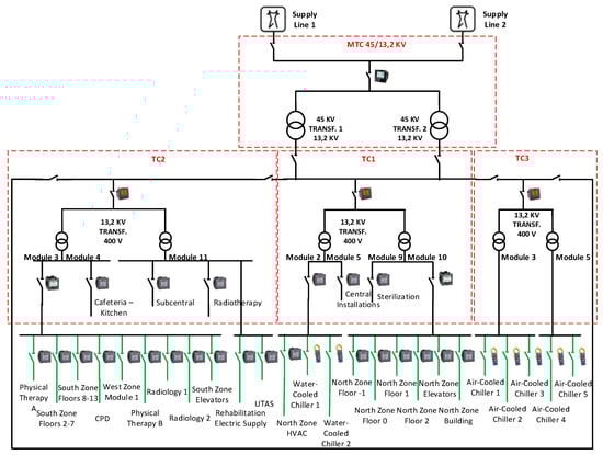 In order to understand the consumption patterns, a submetering network has been designed and developed, installing 30 submeters in the distribution panels. Furthermore, seven other electrical meters have been installed upstream, e.g., in transformation centers TC1, TC2 and TC3 and their output modules (cells), including one at the main supply point (MTC). Figure 2 depicts the single-line diagram of the electricity supply at the León University Hospital with the corresponding electrical meters.