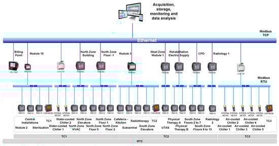 Specifically, an ION7650 meter has been installed in the MTC which measures the whole electricity consumption of the building. This meter is installed at the same point as the billing meter of the electricity supplier, so it is possible to compare both measures. Each of the three TCs is composed of several modules (cells) in which measuring equipment has been installed. In the TC1, an existing meter is used to measure the whole consumption in this center. Furthermore, 4 meters have been installed in Module 2, Module 10, Central Installations, and Sterilization. In the TC2, besides the existing TC2 main meter, there are four other meters installed: Module 3, Cafeteria-Kitchen, Subcentral, and Radiotherapy. The TC3 has an existing meter for the measurement of the total consumption of all the air-cooled chillers. The meters installed in TCs are PM8000 and PM5560 models by Schneider Electric and CVM-NRG96 model by Circutor (see Figure 2).