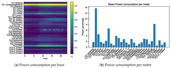 That submetering network provides a huge volume of data for the analysis which can be biased by high consumption areas. Figure 4 shows two visualizations using the mean values of the power consumption during one year. Figure 4a is a heatmap whose values are the mean percentage of the whole building power consumption for each meter and hour. This figure does not show clearly the hours when meters have stronger influence in the whole consumption because meters with higher consumption overshadow the consumption peaks of the other meters. Figure 4b reveals that there are two meters that use nearly 25% of the energy of the whole building, so these two meters mask the influence of the other meters. For this reason, it is necessary to propose a modeling technique that maximizes the acquisition of relevant knowledge to understand the whole building consumption, being able to effectively model the power consumption peaks instead of just discovering which meters provided a higher consumption.