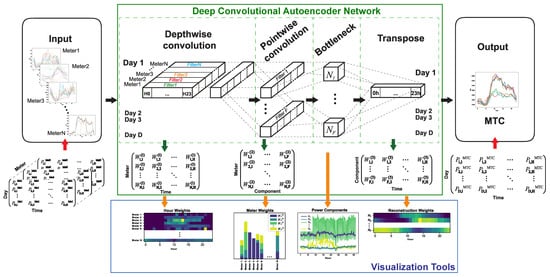 where denotes the power consumption of one submeter (it corresponds to a meter on the level 3 of the submetering architecture), for a sample time H of a certain day D. The sum of all N submeters installed in the low level (3) of the submetering architecture is approximately the same as the measurement of the top level meter MTC, where power is denoted as . That sum is not exactly the same, due to the losses and noise in the submetering network []. The autoencoder is not only expected to provide relevant information through the analysis of the bottleneck neurons, but it should also remove noise from the measurements in the grid.