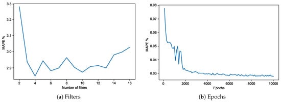 All the data used in the training phase are used to compute the performance metric. Note that the proposed approach does not aim at providing the most accurate regression. Instead, feature extraction is the ultimate target of this approach, i.e., the approach solves an unsupervised problem. The most important parameter that must be tuned is the number of convolution filters because it sets the number of neurons in the bottleneck layer. As stated in the previous section, the MAPE is used to tune the model (See Figure 7). The lowest value (2.81 %) is reached when the number of filters has been set to 4 (See Figure 7a) and the number of epochs to 5000, since the error remains almost constant from this point on (See Figure 7b).