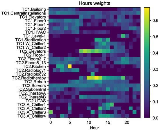 Finally, the weights of the transpose convolution let us study the relation between the components obtained by the pointwise convolution and the hours, providing information about the hourly behavior of the fundamental components which are obtained in the previous step of the methodology. It can be seen that weights are higher during some hours of the day only for some components. If these results are analyzed along with those from the pointwise convolution, it is also noticeable that those components whose consumption varies the most throughout the day are the ones related with chillers consumption and areas with specific operating hours. These findings could be useful for the consumption peak flattening.